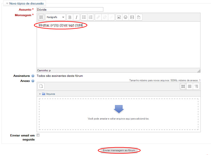 No Moodle,vá ao local onde deseja enviar seu exercício ou dúvida e digite dois cifrões "$.$", cole a fórmula e acrescente mais dois cifrões "$.$" e ao finalizar, envie seu exercício ou dúvida. Veja como a fórmula deve ficar na imagem abaixo: