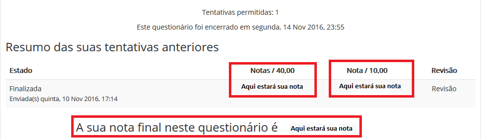 1 – Para ver a correção do Questionário, primeiramente, você deve estar logado no ambiente (Moodle) e ter acessado à disciplina/curso desejado;2 – Em seguida, dentro do tópico ou aula, clique sobre a atividade “Questionário” (ícone com papel ticado), conforme mostra a imagem a seguir:3 – Logo após, você será direcionado à tela do questionário. Role a tela para baixo e, então, você verá a correção do seu questionário: