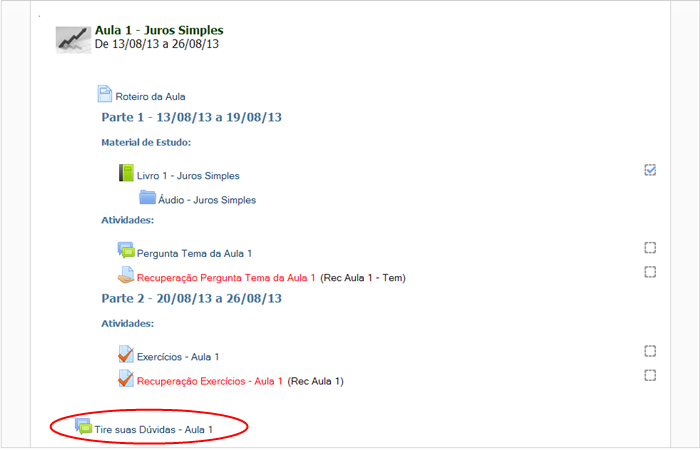 No ambiente da disciplina, existe um fórum chamado Tire suas Dúvidas, onde os alunos postam suas dúvidas e o professor publica as respostas.